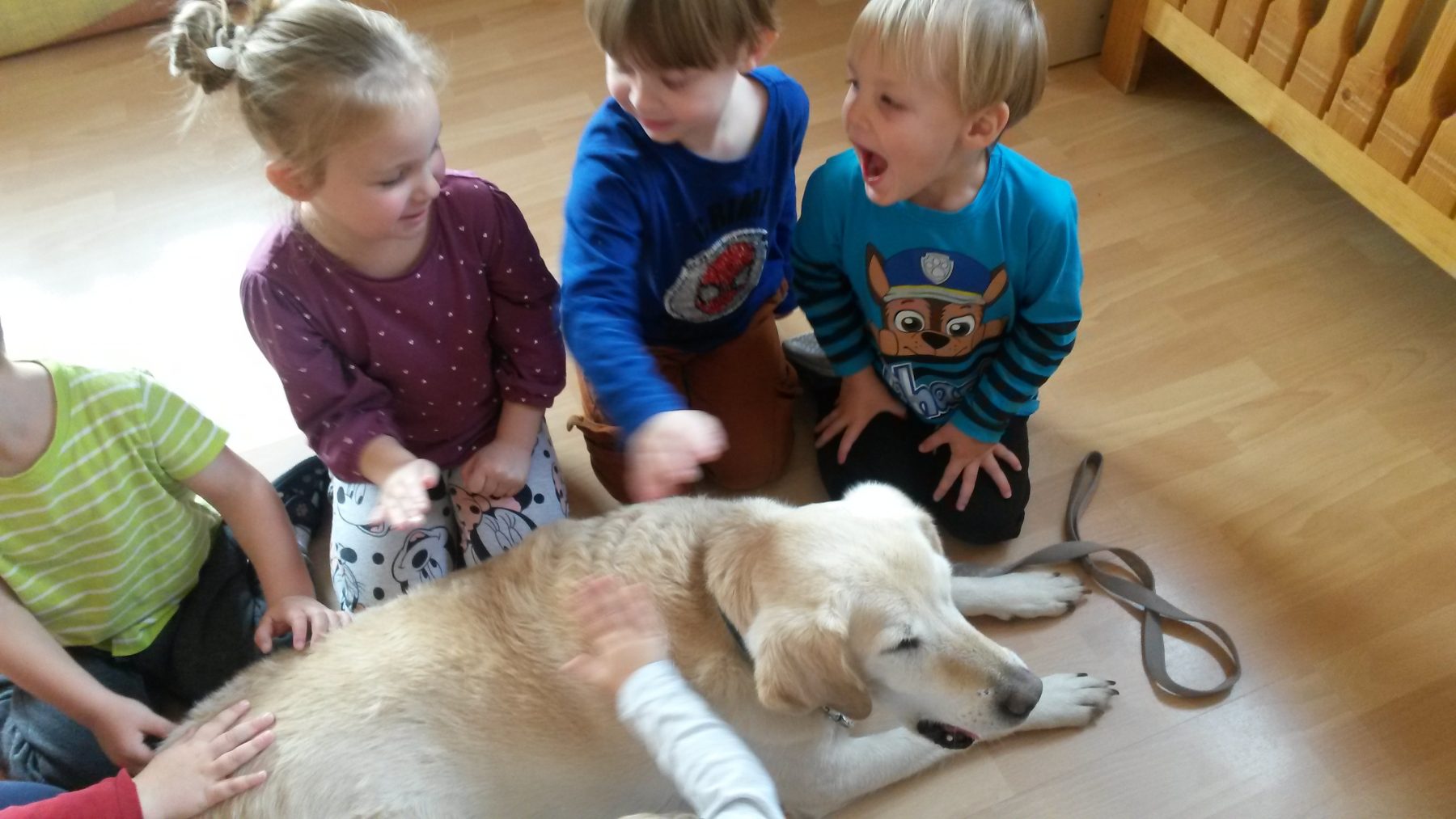 Dzisiaj w Przedszkolu odbyły się zajęcia Dogoterapii z psem Dino. Wszystkie dzieci były bardzo dzielne szczotkowały, głaskały i bawiły się z psem. Dziękujemy Radzie Rodziców za zorganizowanie spotkania.