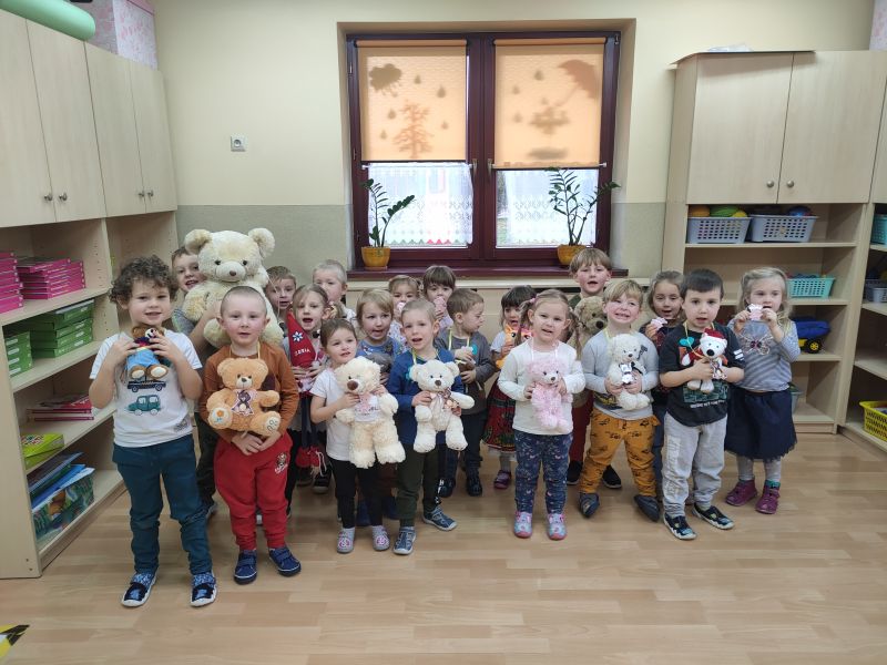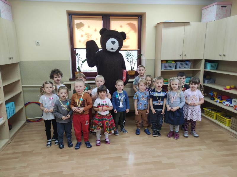 Dzisiaj w naszej grupie obchodziliśmy “Dzień Pluszowego Misia”, z tej okazji dzieci przyniosły do przedszkola swoje ulubione misie. Na początku każde dziecko, zaprezentowało swoją maskotkę grupie. Następnie dzieci bawiły się swoimi misiami podczas zabaw ruchowych (specjalnie przygotowanych na tą okazję). Na koniec odwiedził naszą grupę “prawdziwy” miś – tata Martynki. Pobawił się z dziećmi, poczęstował cukierkami oraz podzielił się wiadomościami na temat życia niedźwiedzi (pożywienie, sposób życia). Dzieci były bardzo podekscytowane spotkaniem i bardzo zadowolone.