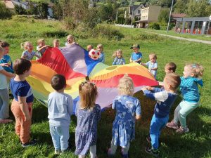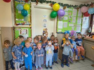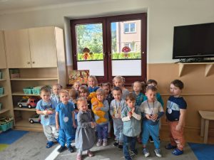 W piątek 19 września obchodziliśmy Dzień Przedszkolaka . Z tej okazji przedszkolaki ubrane były na kolor niebieski. Na początku wspólnego świętowania , po złożeniu przyrzeczenia dzieci zostały pasowane na przedszkolaka i otrzymały medale ” dzielnego przedszkolaka” . Następnie czekał na nich słodki poczęstunek, po którym odbyły się wspólne zabawy w sali oraz na świeżym powietrzu.