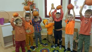W przedszkolu zorganizowano Święto Dyni. W tym dniu dzieci miały okazję poznać jak wiele witamin ma dynia. W salach i przed wejściem do przedszkola przygotowano piękne dyniowe dekoracje, a dzieci w tym dniu ubrały się w kolorze pomarańczowym. Zorganizowano konkursy, zabawy, prace plastyczne, a wszystko w roli głównej z dynią. Można było posmakować specjałów z dyni: dżem, ciasto, a nasze Panie z kuchni ugotowały pyszną zupę dyniową. Na koniec dzieci tańczyły do piosenek o dyni. To był miły i sympatyczny dzień. Dziękujemy wszystkim osobom zaangażowanym w ten dzień!