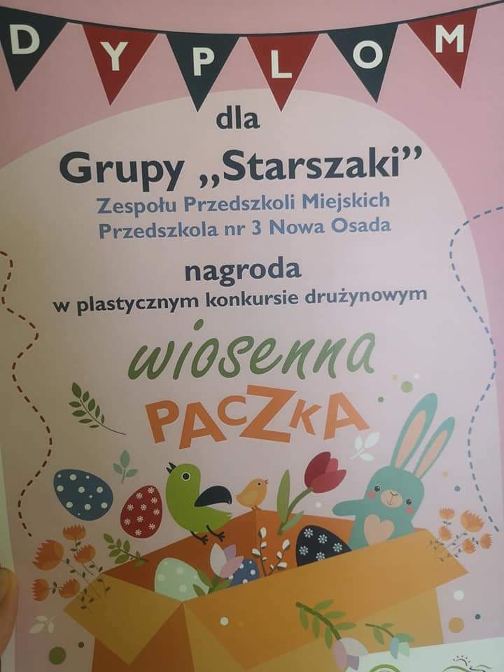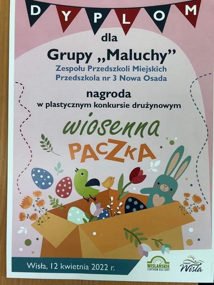 Dzieci z naszego przedszkola brały udział w konkursie drużynowym plastycznym pt.: “Wiosenna paczka” organizowanym przez Wiślańskie Centrum Kultury. Grupy przedszkolne otrzymały dyplomy, słodkości oraz przybory plastyczne.