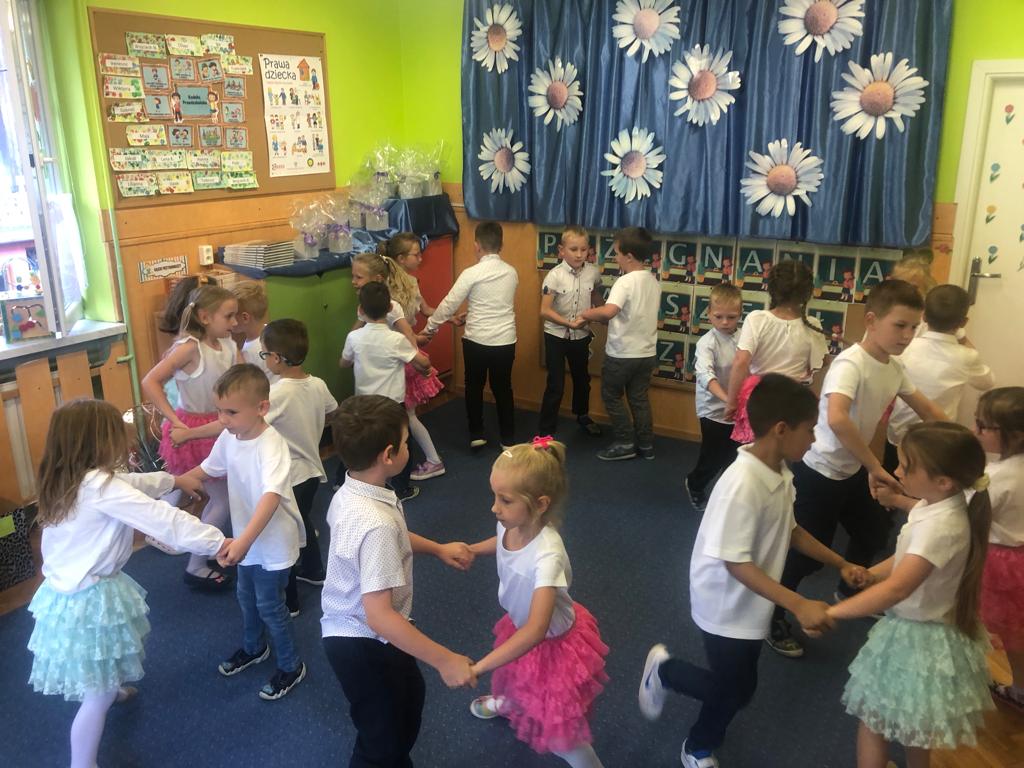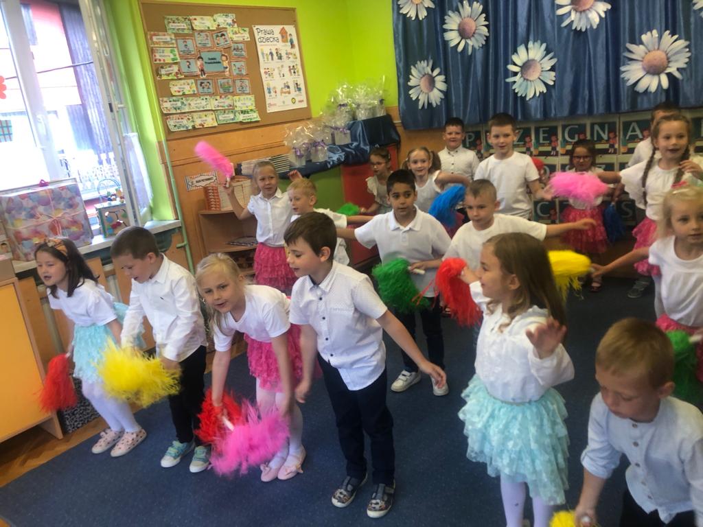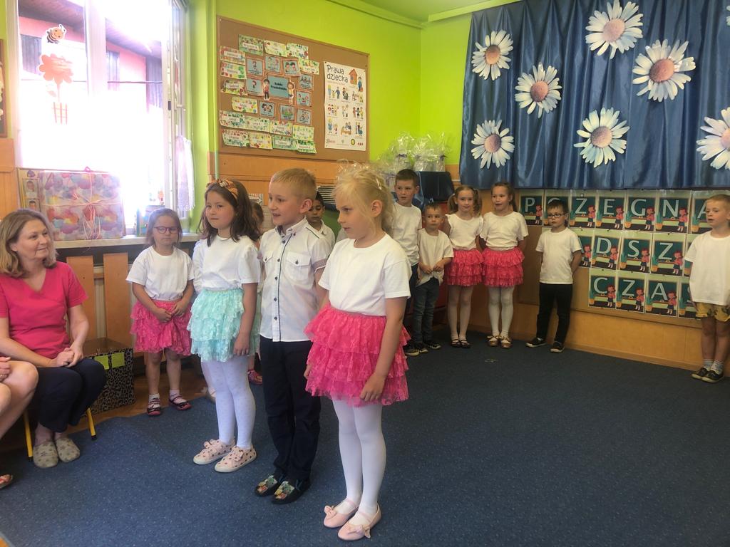 Przed odejściem do szkoły nasze dzieci ostatni raz zaprezentowały swoje umiejętności słowno-muzyczne. Po występie Pani Dyrektor złożyła życzenia wszystkim absolwentom. Dzieci otrzymały na pamiątkę dyplomy ukończenia przedszkola oraz książeczki i upominki. Również młodsze dzieci życzyły starszym kolegom sukcesów w szkolnej ławce.