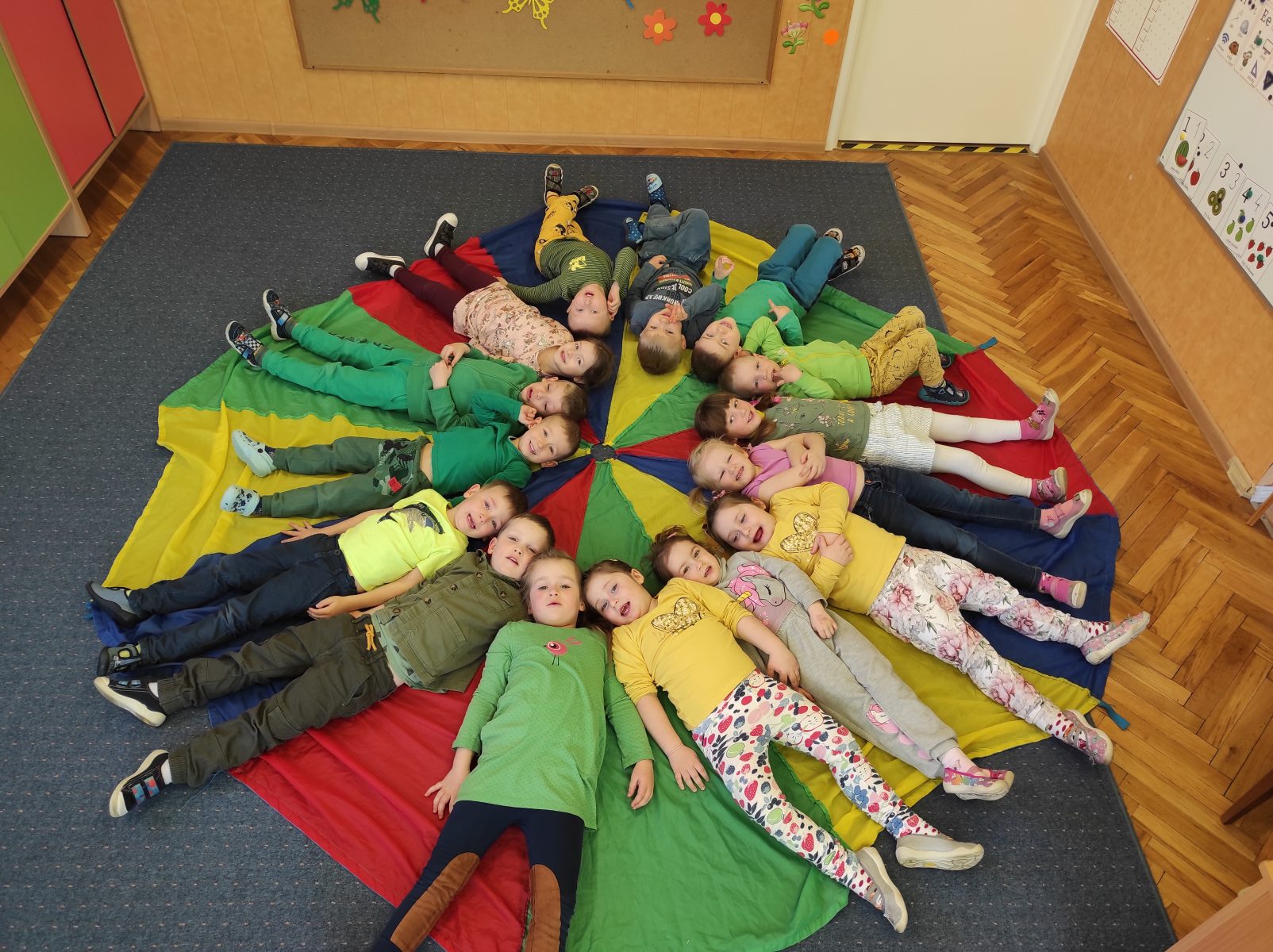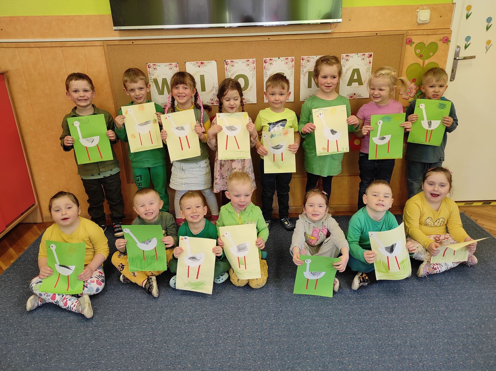 dzieci z przedszkola, którzy trzymają w rękach swoje prace plastyczne - bociany na zielonych kartkach.dzieci leżą w kółku na chuście