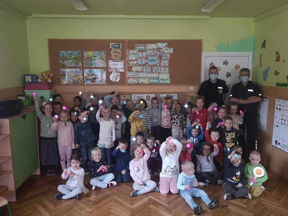 W naszym przedszkolu odbyło się spotkanie dzieci z Panem Policjantem oraz Panem ze Straży Miejskiej. Tematem numer jeden było bezpieczeństwo dzieci na drogach, lecz nie obyło się bez wielu pytań dotyczących codziennej pracy policjanta. Panowie rozmawiali z przedszkolakami o bezpiecznych zachowaniach na drogach. Przypominali również, jak prawidłowo przechodzić przez drogę, a także dlaczego tak ważne jest noszenie ubrań i obuwia posiadającego elementy odblaskowe.